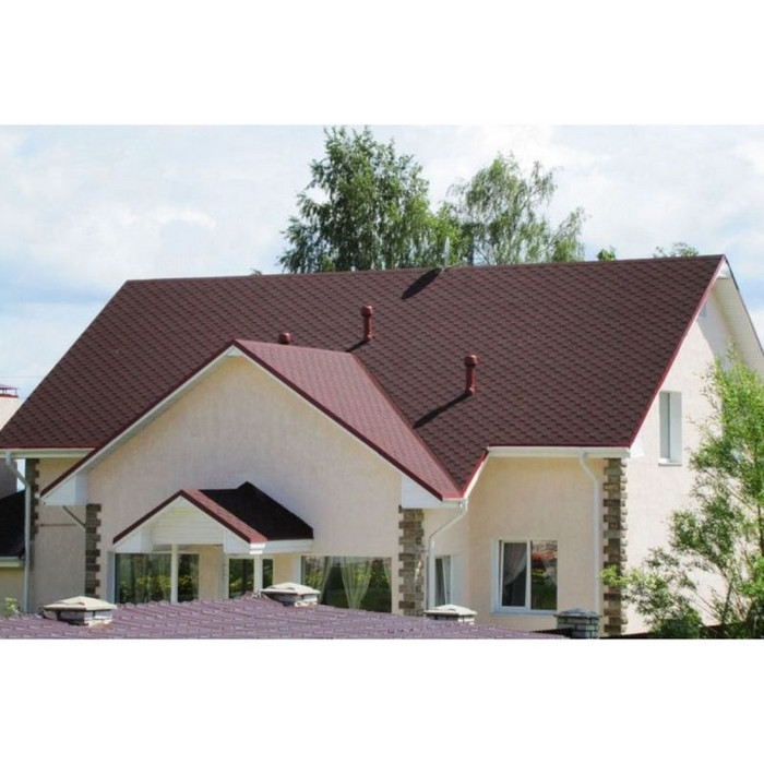 Красный цвет – воплощение благополучия. Он придаст выразительность даже кровлям простой формы с минимумом изгибов и других архитектурных деталей. Красная гибкая черепица особенно эффекта в комбинации с бежевым или светло-серым сайдингом.