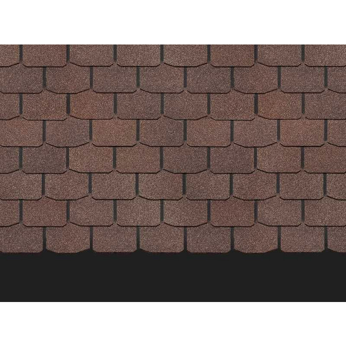 Натуральные коричневые оттенки черепицы хорошо сочетаются с фасадами в сливочных и светло-зеленых тонах. Лепестки лаконичной формы не отвлекают внимание от деталей кровли. Благородный матовый блеск гранулята подчеркивает класс материала.