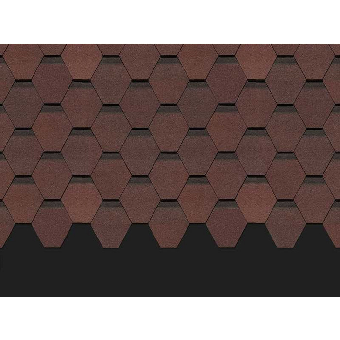 Мягкие переходы каштановых оттенков подчеркивают красоту формы лепестков гонтов. Затемненные участки создают выразительный эффект объемного покрытия. Черепица выигрышно смотрится с сайдингом в бежевых оттенках и под натуральное дерево.
