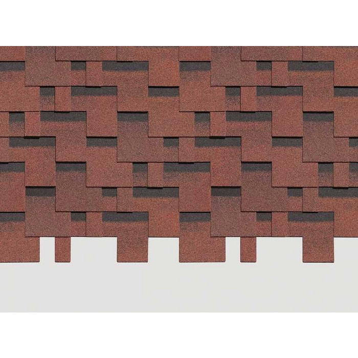Нестандартную форму 3-лепестковых гонтов эффектно подчеркивают переходы темно-красных оттенков и матовый блеск гранулята. Затемненные участки лепестков создают реалистичный эффект тени. Кровля станет доминантой в дизайне, поэтому для оформления фасадов лучше выбирать нейтральные светлые оттенки сайдинга и фасадных панелей.