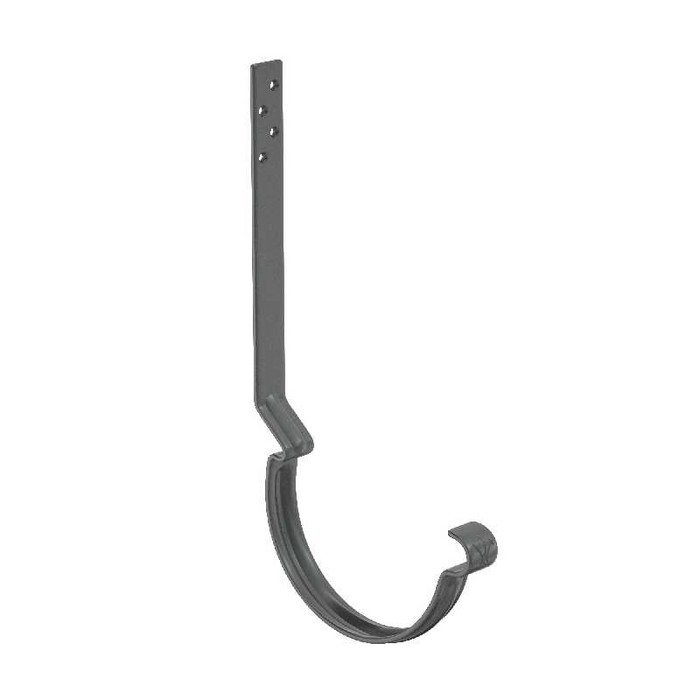 Поставляется с комплектом креплений. Конструкция крюка имеет более вытянутое и глубокое ребро жесткости, поэтому крюк выдерживает повышенные силовые нагрузки. Передний замок крюка фиксирует завиток желоба снаружи, и благодаря этому желоб удобно монтировать даже после установки фартука-капельника. Задний замок имеет конструкцию, исключающую смещение желоба под нагрузкой. Отверстия под крепеж выполнены с зенковкой под шляпку в потай. На передней части крюка расположен фирменный штамп - лилия.