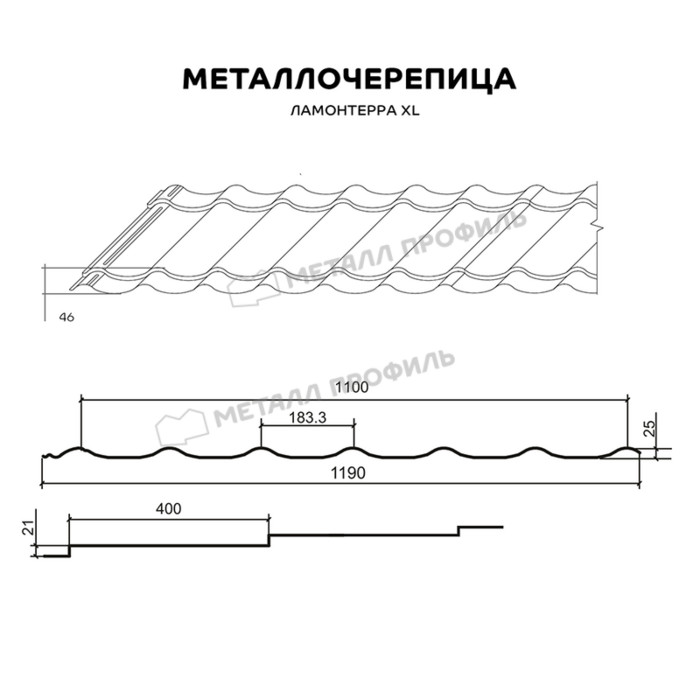 Если вам нужна классическая металлочерепица для крупных крыш, обратите внимание на Ламонтерра® XL. Она характеризуется увеличенными размерами: расстояние между волнами — 400 мм, высота ступенек — 21 мм. Крупные асимметричные волны акцентируют геометрию скатов и сделают крышу ещё более оригинальной.