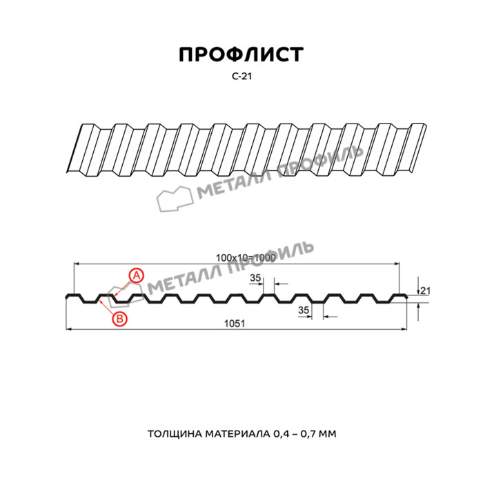 Несмотря на букву С в названии, что значит «стеновой», данный профлист можно назвать многофункциональным. Он станет надёжной базой для герметичной кровли, основательного ограждения каркаса остановочного комплекса и других небольших сооружений. Симметричные гребни профиля помогают ему стать стойком к физическим воздействиям, обеспечивая высокую изгибную жёсткость. Компания Металл Профиль выпускает профилированный лист С-21 в толщинах от 0,4 до 0,7 мм. Чем выше этот показатель, тем прочнее металлопрофиль и дольше срок его эксплуатации. Помимо этого на долговечность строительных конструкций из профнастила влияет наличие полимерного слоя. Окрашенный профнастил является более гармоничным и эстетически привлекательным материалом для решения разноплановых строительных задач.