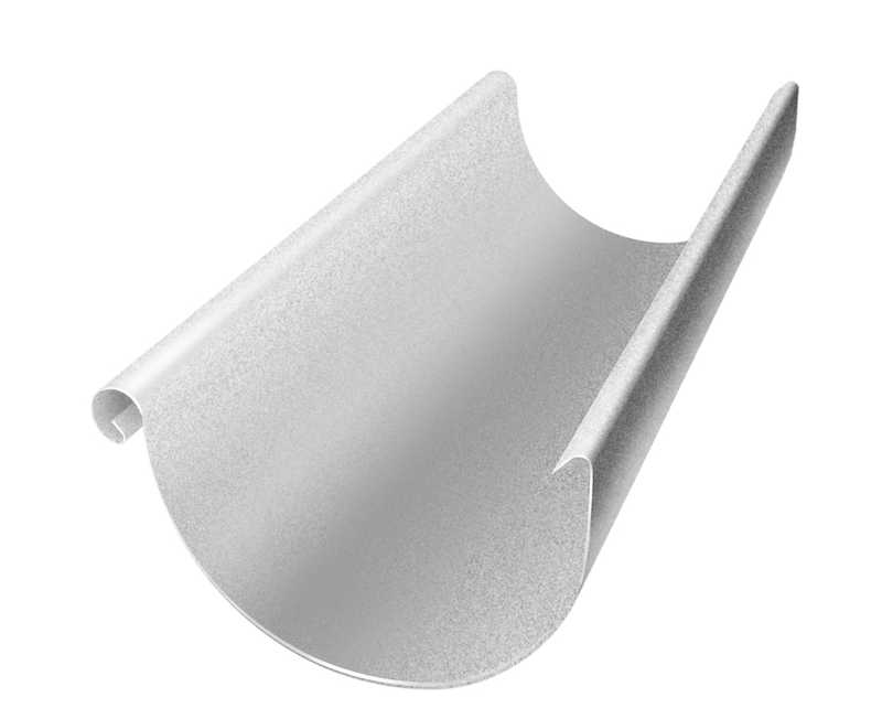 Желоб полукруглый предназначен для сбора дождевой воды с кровли. Желоб фиксируется на крюках, установленных с промежутком 600-900мм и обеспечивающих уклон 5 , мм на погонный метр.